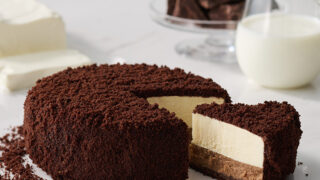 表面はほろ苦いココアに包まれていて、中はドゥーブルフロマージュと同じ二段重ねになっています。上はレアチーズ、下はクリームチーズとチョコを混ぜたベイクトケーキで、たまらない美味しさです!